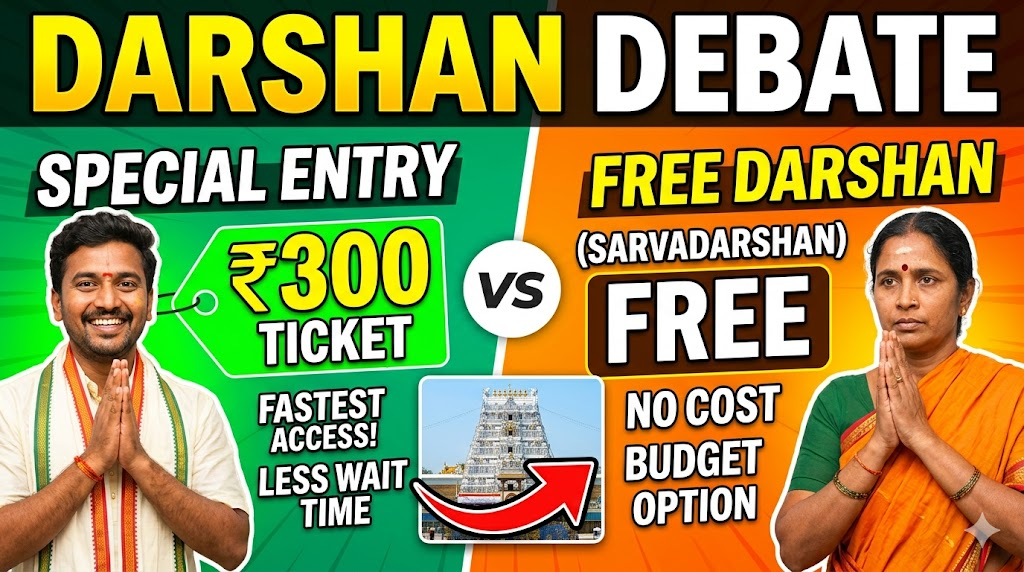 Recommendation: Rs. 300 is the only option. If you are driving from Chennai (3 hours), Bengaluru (6 hours), or Hyderabad (8 hours), you cannot risk a 12-hour free queue. The Rs. 300 ticket allows you to complete darshan and return home the same day.